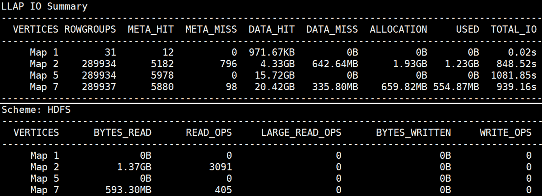 In the first run, the cache for LLAP I/O is empty, and the three Map Vertexes read 80.3GB of data from HDFS (BYTES_READ in Scheme: HDFS),